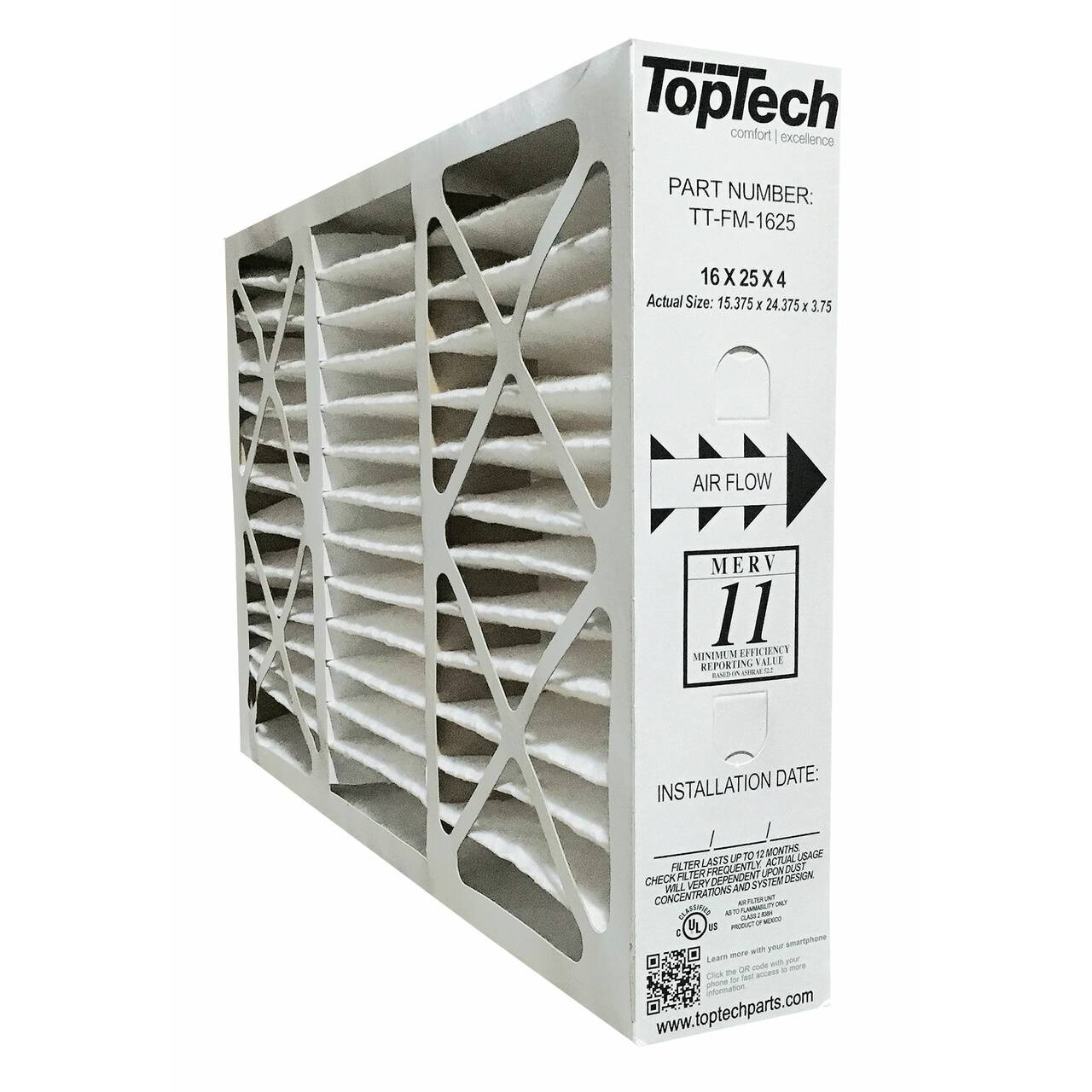 The TopTech TT-FM-1625 16x25x4 MERV 11 Filter removes many allergens dust pollen and other airborne pollutants. Top Tech recommends replacing this 16x25x4 MERV 11 air filter every six to 12 months for optimal performance and effic